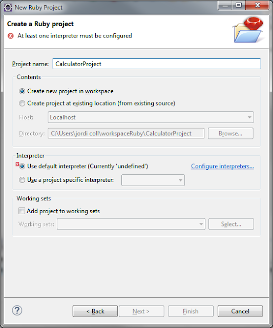 Once we want to create a new project, the system will ask for an interpreter. We will have to configure where ruby.exe is located: