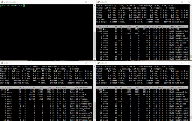 Here you can see an example running 3 CPUs on each PI. Notice how the CPU's reach 100% on each PI.